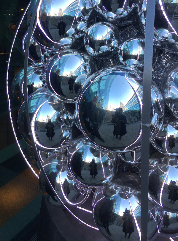 Rolf has been collecting different pictures of reflections and I am happy to add this one. The two of us inside the Christmas tree balls.