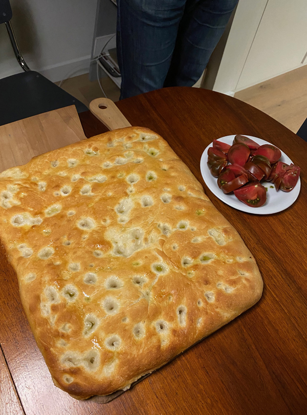 We`ve been watching 'Salt, Fat, Acid, Heat' by Samin Nosrat and it has been such a pleasure. Right after the first episode, we just had to try her focaccia recipe. The special part is that you roll out the yeast dough, press holes in it and put it in salt water afterwards to avoid the dough growing out the holes inside. Afterwards, you cover it in olive oil and bake it. By that, the whole focaccia gets an oily extra salty extremely tasty crust. We had tomatoes with it and it was simply great.