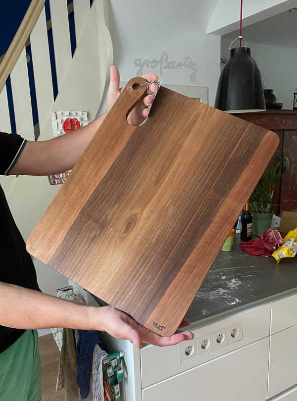 A couple of years ago, we spent some beautiful days in the city of Triest and we bought a wooden board made from walnut which we used ever since. It is thinner than our other cutting boards, but it has aged well - it is still comparatively just. I just remembered the Vud-shop when Tobis sourdough bread spilled over our cutting board AGAIN, and searched the internet for a website. And then I simply ordered a custommade board, again in walnut, and it was delivered quickly. It worked, even without Amazon as a trader. I recommend it to everyone looking for a beautiful and long-lasting kitchen board.