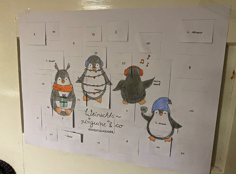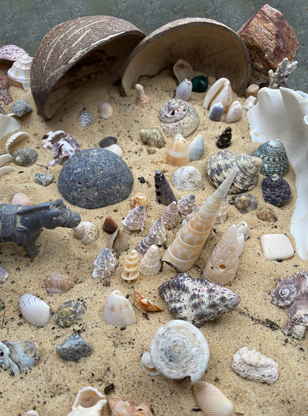 Then it occurred to us that we could find all that in the house: sand and shells and coconut halves. Collected in foreign places and at times when traveling was still allowed and was a natural part of life. We started with a few selected shells. The horse was made of stone and therefore also a natural material, it offered itself as an inhabitant of our landscape. Then all of a sudden we had a half-empty box full of shells left over, but a rather barren landscape. We thought about how refugees feel when they are somehow left and don't have a place to call home. So we used all of them - all of them, without exception - and found a place for them. It wasn't as well ordered then, but we still felt much better about it. So every thing got a new place from us, and depending on which perspective you looked from, every corner was also somehow beautiful. Maybe that was Andy Goldworthy's point: to focus attention on a small section and to emphasize: this is important at this very moment, there is beauty, also - or perhaps precisely because it is fading. Notice it and carry this feeling with you, because you can transfer it anytime and anywhere by using what is available to you at the moment. Sometimes a little paint or a box full of shells is enough.