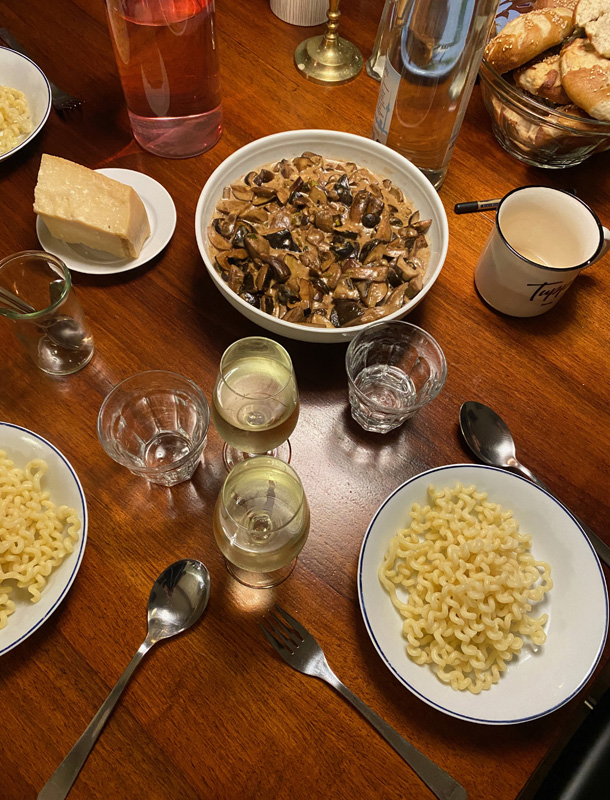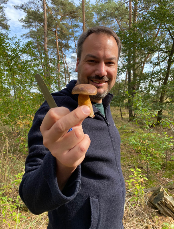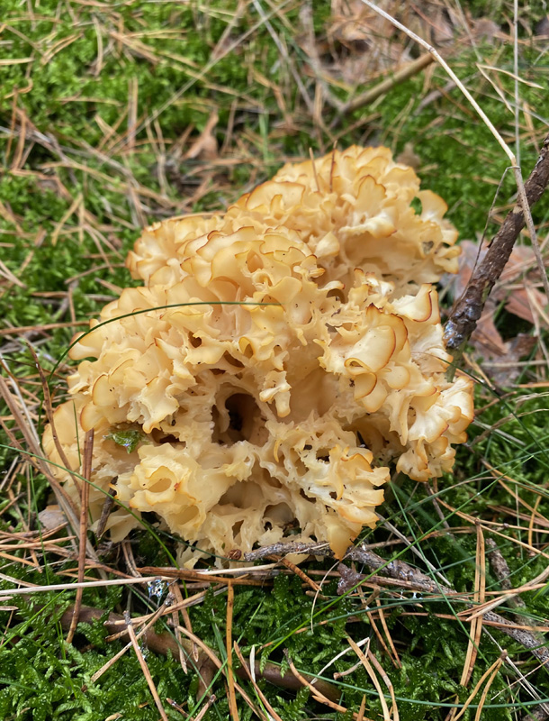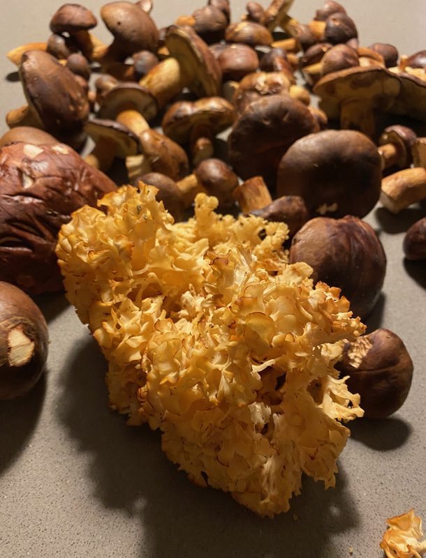 The German name of the mushroom we found today is too funny: "Krause Glucke". I couldn`t find a proper translation, it seems to be called either 'Sparassis crispa' or 'cauliflower fungus'. But "frizzy hen" is a lot more amusing. Anyway, we were lucky to find one, it only happens every ten years. Very yummy!