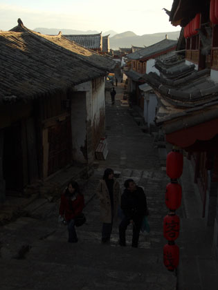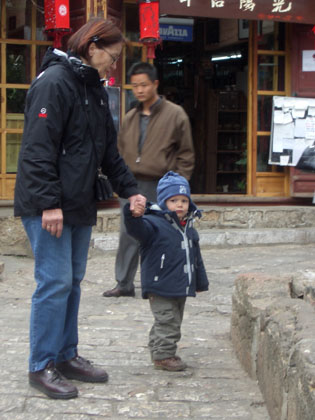 Tobi kündigt an, dass er auch an Weihnachten genügend zu arbeiten hat und in Shanghai wohl nicht dazu kommen wird, richtig frei zu machen. Ich finde das nicht richtig und kaufe für uns, Uschi und Rolf Flugtickets nach Lijiang. Lijiang (zu deutsch "schöner Fluss") liegt in der Provinz Yunnan ("südlich den Wolken"), in der Nähe von Sichuan und Tibet, insofern also am andren Ende von China. Nach einem halben Tag Flug mit Zwischenstop in Kunming sind wir dort und können unser Glück kaum fassen. Wir dürfen einen Teil Chinas erleben, der wirklich noch ländlich geprägt ist. Lijiangs ca. 240.000 Bewohner und Bewohnerinnen gehören zu 80 Prozent der Naxi Minderheit an (davon gibt es außerhalb der Stadt und ihrer Umgebung kaum welche), mit eigener Sprache und einem eigenen Schriftsystem. Minderheit, für uns ein recht merkwürdiger Begriff, in China allerdings recht häufig in Gebrauch. Mehr als 90 (95?) Prozent der chinesischen Bevölkerung gehören dem Han-Volk an, alle anderen einer von 55 Minderheiten. Für diese gelten andere Regeln, so dürfen sie z.B. zwei Kinder bekommen. Ein bißchen wie zum Schutz der vom Aussterben bedrohten Arten.