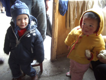 Zurück zu unserer Reise. Lijiang liegt auf über 2000 m Höhe, in einem Tal zwischen Bergen, die bis über 5000 m ansteigen. Der berühmteste von ihnen der Jade Drachen Schnee Berg, ganzjährig von Schnee bedeckt und als Wahrzeichen dermaßen wichtig, dass es - für diejenigen unter den Reisenden, die nur wenig Zeit zum Aufenthalt haben - eine kleine Nachbildung in einem der Parks am Rande der Innenstadt gibt. Sozusagen, damit auch bei schlechtem Wetter ein hübsches Erinnerungsphoto geschossen werden kann. Der Bedarf an solchen scheint insgesamt ungebrochen. Während westlichen Ausländern daran gelegen ist, vor allem zu Entspannen und ein paar hübsche Bilder von Landschaft und Leuten zu knipsen, muss es für die chinesischen Touristen vor allem eines sein: Aufnahmen der eigenen Person. Hier auf der Brücke, da vor dem Gedenkstein, das Photo mit kleinem westlichen Kind kommt auch immer gut. Ebenso für uns abschreckend das Warenangebot. Dachte man beim Anblick des ersten grünen Wollschals mit rotem Muster noch "hübsch, kann ja mal nachdenken, ob ich den brauchen kann", möchte man im 45.ten Geschäft mit haargenau dem gleichen Exemplar nur noch schreiend weglaufen. Von wegen Handarbeit. Wir finden doch ein paar schöne Mitbringsel: ein Glockenspiel (mit 11 Tönen bzw. Glocken) und einige Leckereien: Yakfleisch, San Qi (vom Wörterbuch recht unzureichend mit Pseudo Ginseng übersetzt) und tibetischen Safran, außerdem getrocknete Ameisen als Hausmittel gegen Rheuma.