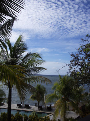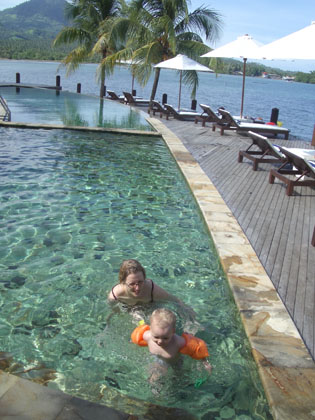 Drei Tage weg von Shanghai und alles erscheint immer noch unwirklich. Milch aus riesigen Kokosnuessen, Fruechte in Schlangenhaut, die aussehen wie Mega Knoblauch und ein Ressort, das sich so perfekt in die Landschaft einpasst, als waeren ausnahmsweise mal Landschaftsgestalter an der Planung beteiligt gewesen. Wunderschoene Materialien, gekonnt arrangiert. Ein Swimming Pool mit Blick aufs Meer, und die einzigen, die neben den Bootsbauern hier Laerm machen, sind Zikaden und Gekkos.