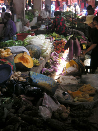 Der Tag ist wie eine komplette Veranstaltungsreihe ueber Pflanzen der Tropen und Subtropen. Alles ist versammelt von Erdnuss ueber Kokos bis hin zu Banane, von Nelken ueber Muskatnuss bis hin zu Zitronengras, Kaffee, Kakao und Vanille. Der lokale Markt zeigt, was weniger bekannt war: Draculas kleine Brueder zum Knabbern fuer zwischendurch. Mag sein, es liegt an eineinhalb Jahren China, aber Huehnerkrallen sind da wirklich der angenehmere Anblick!