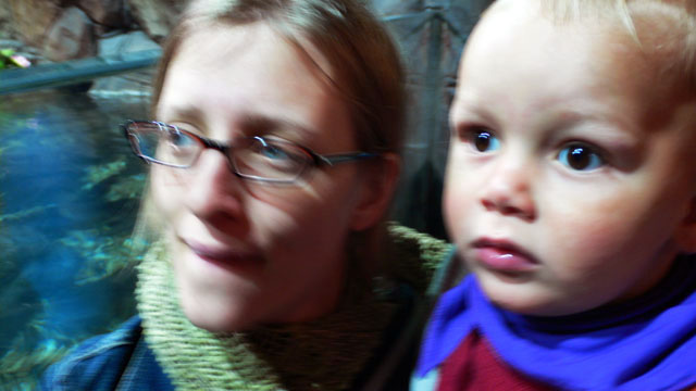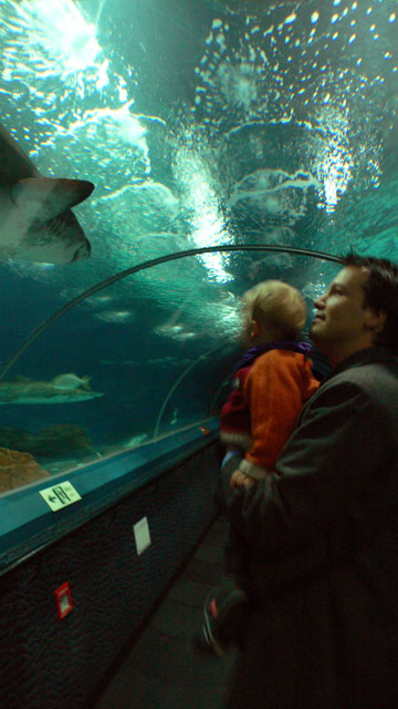 Tobi nimmt sich einen nachmittag frei und wir besuchen gemeinsam mit Moritz das Aquarium. Die fleißigen Leser und Leserinnen werden sich erinnern: hier haben wir letztes Jahr beeindruckende Tunnel und einen einsamen Pinguin in einer Schneelandschaft aus Pappmachée angetroffen. Moritz ist sichtlich angetan, auch von der dortigen Hai-Sonderausstellung. Viele ziemlich kleine und einige recht große Exemplare sind zugegen.