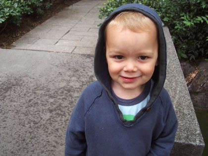 Sonst ist alles prima. Moritz beginnt, Twinkle twinkle little Star zu summen, und sein Wortschatz hat sich enorm vergrößert. Die Sprache Goethes und Schillers ist vertreten mit Ja und Nein, auch! Eis, Bonbon, Fisch, Ei, Ball und Kran, neuere Errungenschaften sind nass (wie es eben ist, wenn man eine Rutsche nach dem Regen hinunterrutscht) und kalt (Moritz bevorzugte Art, sich zu duschen). Außerdem mal(en), Blume, Bau(m) und Fu (Aufzug/Zug). Bus klingt immer noch mehr wie ba-ssi. Auch gut, wir freuen uns über alles. Im englischen kann er no, no, no (mit erhobenem Zeigefinger, so geht es nicht!) sowie byebye.