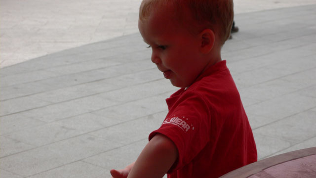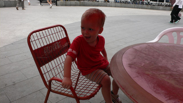 Hier noch ein kleiner Ausflug in seinen chinesischen Wortschatz: bu yao (das brauch, will, muss ich nicht), bu xiang chi(ich will (das) nicht essen), mei you (weg), mei shi (das macht nix), huai le (kaputt/ funktioniert nicht), xia yu le (es regnet), hai yao/ you (will mehr), xing xing (Sonne, Mond, Sterne), paopao (Seifenblasen), huang (gelb), dao (Messer), tang (heiß), (da) kai (aufmachen), pa (klettern), shui (Wasser, Milch, Saft,Suppe), pa (Angst haben, z.B. vor Autos oder Hunden), tengteng (tut weh), mai (kaufen), bao (Tasche), ting (stop), hua (Blume), xie (schuhe), xiexie (danke), Ku (traurig, weinen), da (groß), xiao (klein), che (Fahrzeug), da diao che (Kran), yu (Fisch), ma (Kuh, Pferd, Esel). Dazu kommen die Tiergeräusche: Wa (Frosch), Oooo (Hahn), Miao (Katze), Ah ah (Hund, wieso auch immer), Gaga (Ente), Mäh (Schaf) und Mmmhh (Kuh). Und diePersonen: Yeye (Opa), Nainai (Oma), Ayi (Tante), Gege (großer Bruder), Didi (kleiner Bruder), Kaka (Oscar) und Yaoyao. Mama und Papa (Baba) sind mehrsprachig!