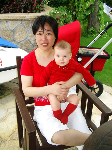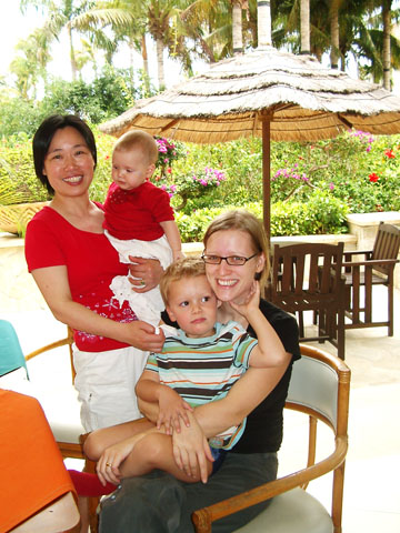 Wir wagen es nach einem ziemlich entsetzlichen Abendessen beim Chinesen und einem Abend mit Zimmerservice doch noch ein letztes Mal, mit den Kindern in ein Restaurant Abend essen zu gehen. Moritz hat schon fertig gegessen, Kilian auch, die beiden wuseln irgendwo mit der Ayi herum, (die hat auch schon fertig gegessen, natürlich), so dass Sonja und ich entspannt noch aufessen dürfen. Wir unterhalten uns über die Situation, mit kleinen Kindern unterwegs zu sein, absurderweise auch noch in einem fünf Sterne Hotel. „Wie ist es denn, wenn man Zwillinge in Lukas Alter (15 Monate) hat?“ – „Na, dann macht man so was eben nicht.“ „Und ohne Ayi?“ – „Na, dann auch nicht. Wahrscheinlich fahren normale Leute höchst selten mit mehr kleinen Kindern als Erwachsenen für ein paar Tage ans Meer, und wenn, dann muss man eben gewappnet sein, dass an dem Abend, wo man sein tollstes Outfit trägt, das eine Kind dann genau in dem Moment, wo man das Restaurant betritt, in den Ausschnitt kotzt.“ Plötzlicher Blick nach unten, denn gerade ist ein Salatblatt von meiner Gabel auf Mias Kopf gefallen. Es bleibt selbstverständlich in der Mitte liegen, und Mia grinst dazu herzallerliebst. Ich habe lange nicht mehr so gelacht.