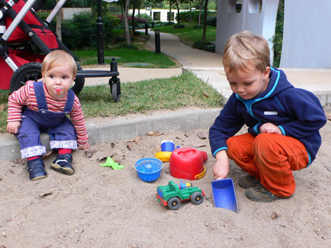 Da passiert das Ultimative, die Deutschen werden Weltmeister im Fußball, und der Großteil der Spiele findet ausgerechnet an dem Ort in der großen weiten Welt statt, an dem wir gerade leben: in Shanghai. Die Eröffnung jedenfalls und auch das Endspiel. Und was tun wir? Wir kriegen, wenn überhaupt, nur am Rande etwas davon mit. (Apropos: Ist Frauenfußball wengistens in der Heimat populärer geworden?) Tobi arbeitet (ebenso wie ein Weltmeister), und dem zur Folge bin ich abends so unmotiviert, dass ich nicht mal den Fernseher anschalten mag. Und das zur besten Sendezeit! Ich schäme mich wirklich. Genauso die Specialympics: alles hängt voller Plakate, und nicht nur die Wächter des Compounds, nein, jeder Taxifahrer der Stadt trägt orangefarbene T-Shirts mit der Aufschrift "You know I can!" (eine etwas seltsame Übersetzung des chinesischen "ni xing, wo ye xing", das ich eher übersetzen würde mit "du schaffst es, ich auch!"). Leider ist aber Golden Week, deshalb hat nicht nur der Kindergarten geschlossen, sondern ist auch unsere Ayi in Ferien, und so hängen Moritz, Mia und ich tagaus, tagein auf dem Spielplatz und im Spielhaus herum, wenn wir nicht gerade zu Hause sind oder bei anderen zu Besuch. Hach ja.