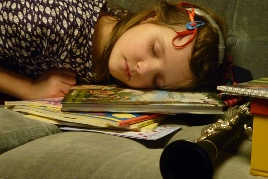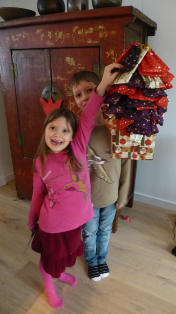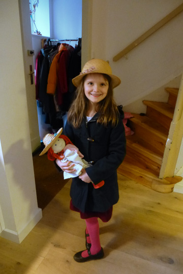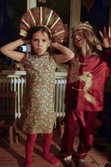 Mia and Charlie posing as Asians, and Mia dressing up walking her doll Lotta.
