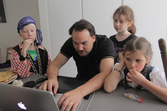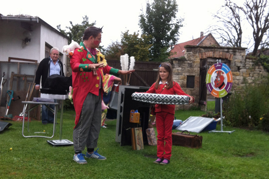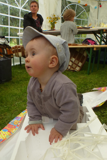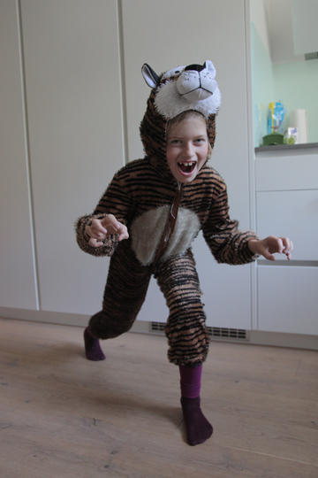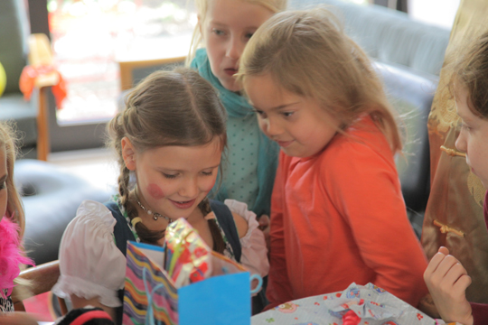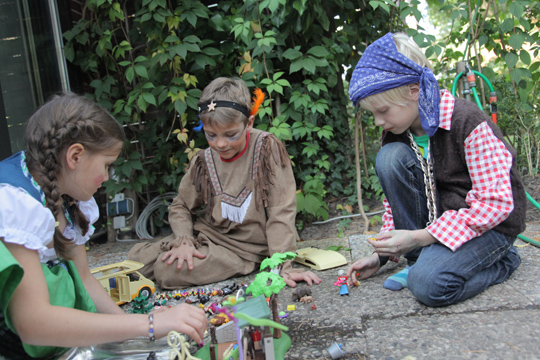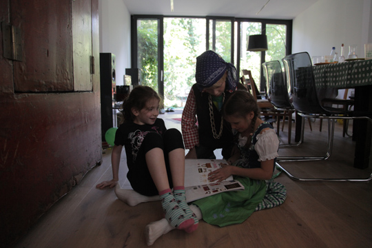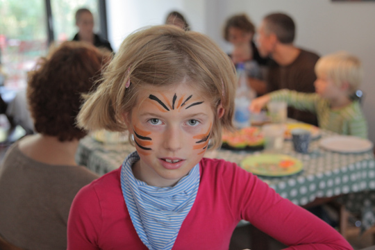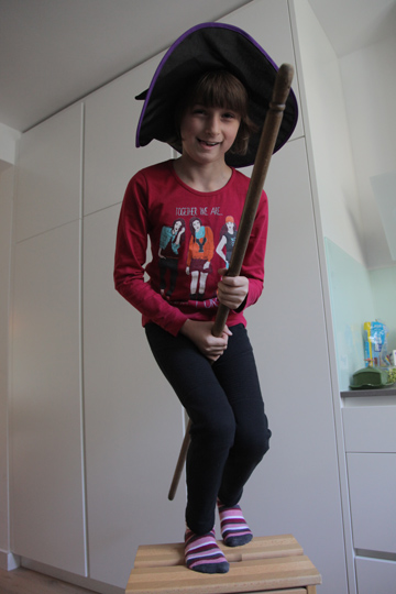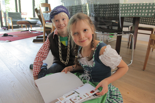 Mia enjoyed dressing up at Moritz last birthday party so much that she wanted to have the same kind of activity for her party, too. Here are some of the pics Tobi turned into picture postcards with funny backgrounds afterwards. The party was relaxed, with kids playing with Playmobil (which they actually rarely play with on normal occasions) and filling sticker albums. I enjoyed having girls and boys still mixed up and was wondering, how long that peace will still last?