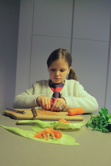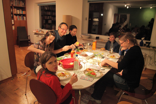 Even the rabbits got something prepared (a salad). I did princess Leias hairdo on Mias head, while Tobi helped Moritz frying fishballs. Karsten came visiting, and we spent some great hours and shared good food.