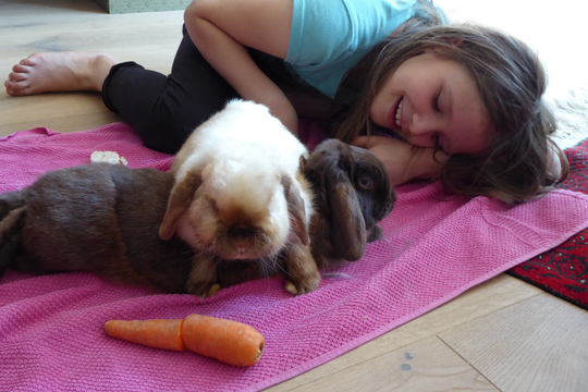 Now and then, the rabbits still dig tunnels and hop away. Last time, the whole construction needed mending, so much to Mias joy I did the repairwork while she looked after Emma and Franz.