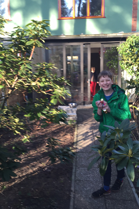 It`s rather difficult to write on uncertainties and bad things happening. But as life doesn`t consist of delicious meals, well-behaved kids and fulfilling jobs only, shit is supposed to happen now and then. I was prognosed with a bladder infection, went home, drank a lot and took antibiotics. Unfortunately, it was no bladder infection, so I was prognosed with kidney stones. Since those did not appear on my birthday CT, I was prognosed with kidney stones that my kidney had gotten rid of by itself. Unfortunately, I still got renal colics and had to be hospitalised Good Friday. So all our Easter plans fell through. To keep me in good humor, Tobi send pictures of what is going on at home, and I am happy to have the opportunity to share them with you.