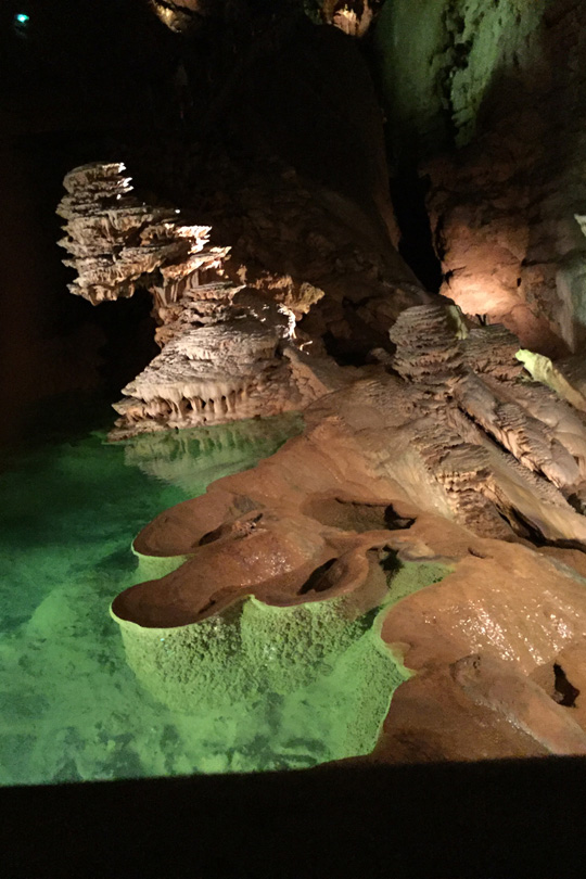 The gouffre de Padirac is a giant chasm, that was created at an undetermined point in time when the roof collapsed into a large internal cavern. It is known that the cavern existed in the 3rd century, and was inhabited during the 15th and 16th centuries during which time Potassium nitrate was excavated from the area. The chasm itself is approximately 100 m around its rim with a diameter of approximately 35 metres. The cave, at a depth of 100 m, contains a subterranean river system that is partly accessible by boat.
