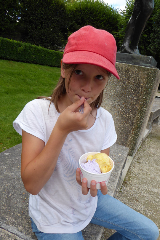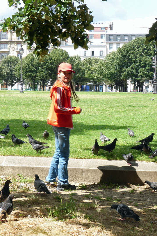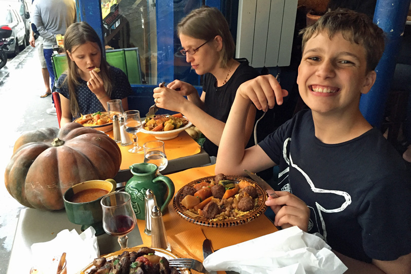 Tobi and I had been to Paris in the summer of 2001, and this trip was crucial to all the following years of our relationship. We had set on the stairs of Sacre Coeur, with a glass of red wine each, and had enjoyed the view, the wine and each others company so much, that our backpack got stolen without us realizing it. We were young, and had booked some inexpensive hotel that seemed so little trustworthy that we had all our valuables with us, in that exact backpack. The flight tickets, my passport, my wallet, my diary, both of our favourite jumpers, and on top of it a Nikon F2, the camera that had accompanied Tobi through all his childhood. (We are still sorry for that, Rolf!) To sum it up, there was basically nothing left, and we were more than punished for it, too. It was a time when flight tickets were printed on paper, and we had paid about 400 DM for them. So we were astonished the flight company charged us another 250 DM to print the return tickets for us anew. When I complained to the Lufthansa staff, she unapologetically replied I should be grateful that they were letting me board at all without proper identification. So there we were, sad and bankrupt, and we had one more evening to spend. Tobi walked straight to the next FNAC, and bought a Paris gourmet guide (at least, he still had his wallet with a credit card) and we chose an expensive restaurant to have dinner, where we spent a great evening and enjoyed one of the best meals I ever had. Tobi summarised, we were basically flat broke, so it didn`t matter how flat. This was our first trip as a couple, and the lesson I learned (despite from you just need to drink more alcohol if your stomach is too full to order new courses): shit happens, but it is our choice to react to it. Whenever I think of Paris, I fondly think about that massive heap of Mousse of chocolat that the waitress served last, and it was a big pleasure to show that wonderful metropolis to our kids. Even though I was also happy we were not robbed this time!